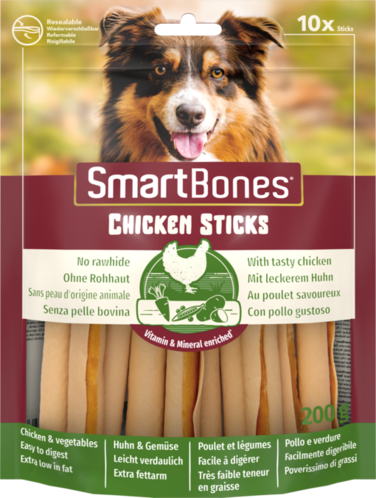 SmartBones have all the benefits of a rawhide chewWITHOUT the RAWHIDE!Many veterinarians are concerned with the potential health risks associated with dogs consuming rawhide. NO RAWHIDE SmartBones are made with REAL CHICKEN and wholesome VEGETABLES for a scrumptious taste dogs can't resist! Made with Real Chicken and Vegetables Rawhide-Free Easy to Digest Vitamin & Mineral Enriched Chewing Helps Maintain Healthy Teeth