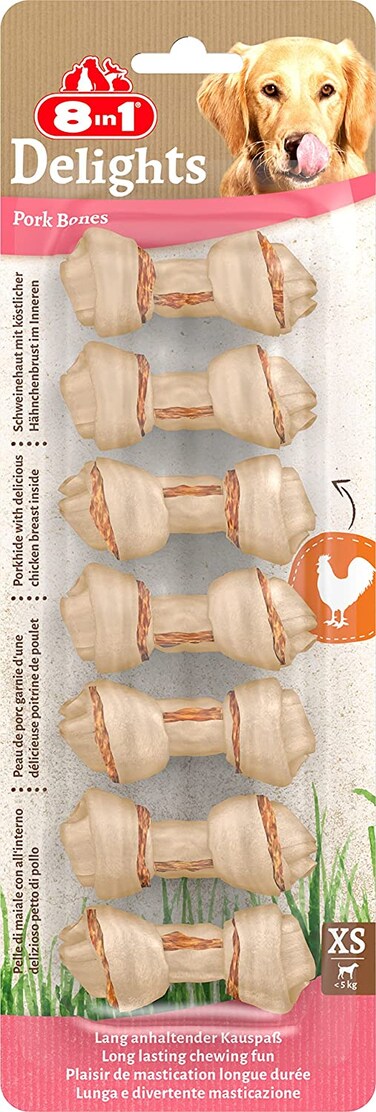 Adult small breed dogs (1-12kg) A chewy bone made from pork hide with wrapped chicken meat. This deliciously succulent combination keeps your dog busy and offers intensive chewing pleasure Long-lasting chewing fun whilst enhancing dental care 6% fat. Free from artificial colors and flavor enhancers