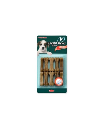 Fresh Chews Baby are made from real animal hide; these chews are suitable for puppies aged 2 to 12 months. Made from real beef hide, they help reduce the formation of tartar, partly due to their abrasive effect, but also thanks to the sodium hexametaphosphate in the formula, which helps stop the formation of tartar by binding the calcium found in saliva. They also contain calcium, which puppies need to build strong bones and teeth as they are growing.