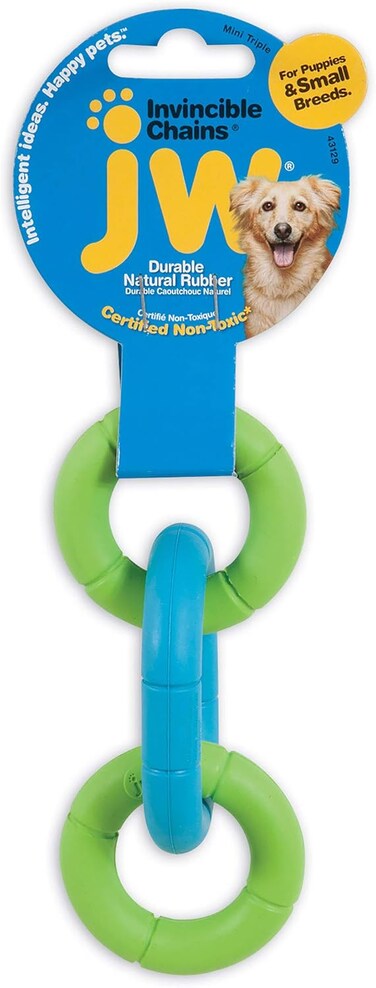 Invincible Chains is made up of three durable rings composed of natural resilient rubber. JW's patented molding process links each ring together with no seams and no glue to produce a strong long lasting toy. Tug, toss, fetch and chew the Invincible Chain will provide hours of fun for your dog. Excellent for small and toy dog breeds.