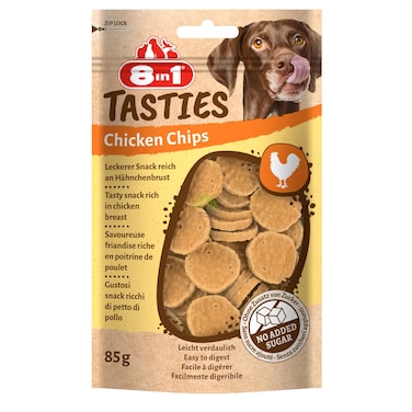 - 8in1 Tasties Chicken Chips are rewarding meat snacks your dog will love. Made of delicious chicken breast, these hearty and healthy treats are the ideal snack for dogs for in between meals. This snack is rich in chicken breast and in proteins. Proteins help to build and maintain lean muscle mass for top body condition. 8in1 Chicken Chips are easy to digest, have no added sugar and are low in fat. They are formulated without flavour enhancers, GMOs, artificial preservatives and colourings. The oven baked treats are rich in protein and do not contain gluten. 8in1 Tasties Chicken Chips are an ideal snack for all size dogs. Let your dog enjoy our tasty Chicken Chips!