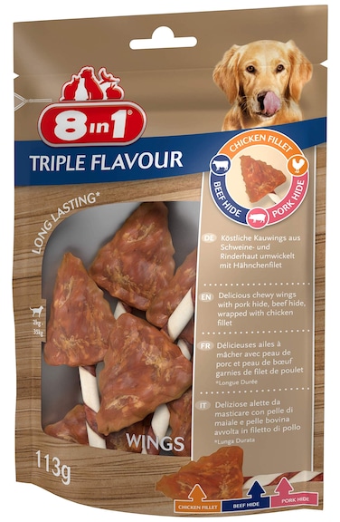 The 8in1 Triple Flavour range of delicious rawhide chewy bones made with pork hide and beef hide, wrapped with chicken fillet to keep your dog busy. Long lasting chewing fun helps tartar and plaque control.