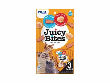 Juicy Bites are irresistibly moist, bite-sized soft tuna and chicken treats seasoned with natural flavors, green tea extract and vitamin E. No grains, preservatives or artificial colors. Each package includes three individual treat packs to maintain maximum freshness and each treat pack has two fun shapes in two different flavors to keep cats satisfied.