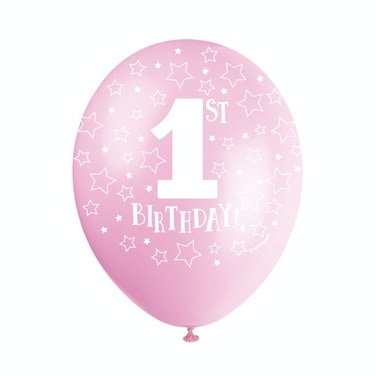 - Set up a charming party scene with these delightful Latex Pink 1st Birthday Balloons. Featuring "1st Birthday!" text with a pretty stars design printed all over, these pink party balloons are ideal for adding decorative bursts of shimmering colour to a girl's first birthday party.
