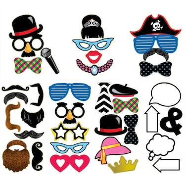 Leave these photo props out in a photo booth for guests to grab and pose with during the celebration. You can also simply leave them out on a table near a fun picture-taking backdrop for everyone to pose with while a friend snaps away. Package of 60 Party Photo Booth Props, comes in an assortment of silly designs and come with stick handles to attach.