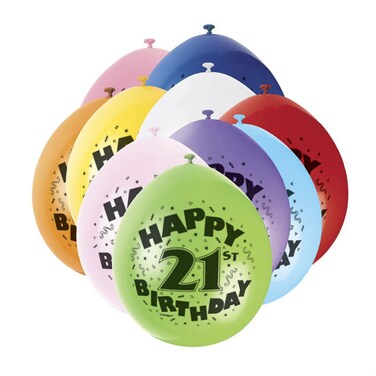 With "Happy 21st Birthday" lettering printed on one side, these party balloons are designed to be filled with air and hung from the ceiling to ensure the printed text is right-side up. Whether they're hung individually throughout the room or bunched together in balloon bouquets, these latex balloons will be a cheerful addition to the celebration. Pack of 10 Latex Assorted Happy 21st Birthday Balloons, measures approximately 9" (23cm) when inflated (ship uninflated) and are designed to be filled with air.