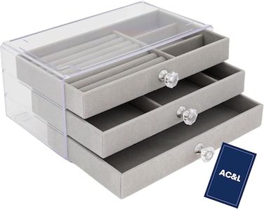 AC&L Acrylic Jewelry Organizer Box, Clear Stackable Jewelry Storage Case for Earrings, Necklace, Bracelet, Rings with Adjustable Velvet Trays for Women on Dresser Vanity (Grey)