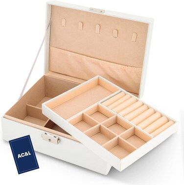 AC&L Jewelry Organizer Box For Girls And Women, PU Leather 2 Layer Jewellery Storage Box Case For Earing, Necklace, Bracelet, Rings And Accessories (White)