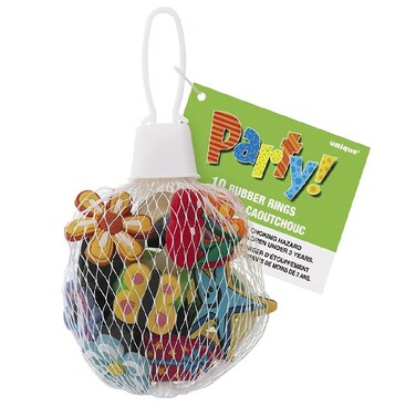 Each net bag comes with 10 assorted shaped Rubber Die-Cut Rings-- flowers, butterflies, and more. Give these rings out at your next princess party, slumber party, or birthday party. Rubber Rings measure approximately 1.5".