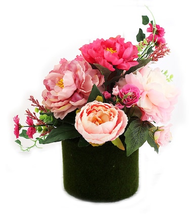 Floral Arrangement Pink Shades Flowers Green Leaves Grass Base 35cm