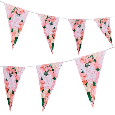 This pretty bunting could be hung against a wall or behind the table tops. Each pack is made of 12 floral printed paper flags which are joined with the white twine. The bunting is 3m in length.