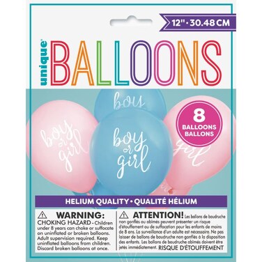 - Pack of 8 gender reveal balloons containing 4 pale pink and 4 pale blue 12" latex balloons with white print.