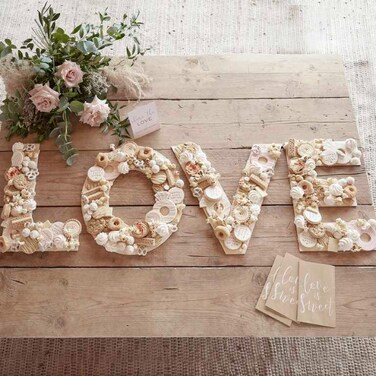 The large card letters spell out LOVE, making it the perfect grazing platter for weddings, engagement, or anniversary parties, and the kit includes a card tent sign with the text "Share The Love, Please help yourself". This Love Grazing Board measures: L: 41.5cm (H) x 27.5cm (W) O: 41.5cm (H) x 32.7cm (W) V: 41.5cm (H) x 42.6cm (W) E: 41.5cm (H) x 27.2cm (W) 1 x ‘Share the Love’ Tent card measuring 14cm H when folded. Complete the look and decorate your grazing board set up with other items from our beautiful botanical wedding range. Packaging is recyclable and FSC certified.