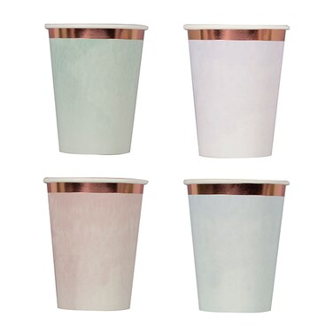 The subtle watercolour design has rose gold foiled accents to add some sparkle to your set up. Use with matching watercolour party tableware to complete your theme!Each pack includes 8 Pastel Watercolour and Rose Gold Edged Cups:2 x Lilac Cups2 x Mint Cups2 x Pink Cups2 x Light Blue CupsEach cup holds 9 oz and measures 7.5cm (W) x 9cm (H).