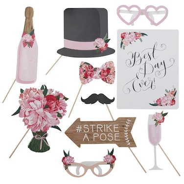 Create your own Photo Booth fun by posing with these lovely novelty props. Each Photo Booth pack contains: 1 x Best Day Ever Sign, 1 x Bouquet of Flowers, 1 x Bow Tie, 1 x Champagne Glass, 1 x Top Hat, 1 x Moustache, 1 x #Strike a Pose Sign and 2 x glasses. Each prop is around 25cm in height and has a thin wooden handle to hold on to.