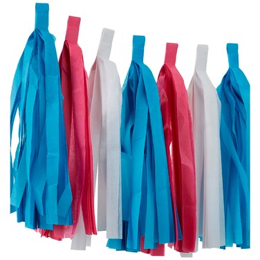 The tassel garland is 2.5 metres in length and consists of pink, blue and white tassels.Other products in the Little Lady or Mini Mister range are available including bunting and fun photo booth props.