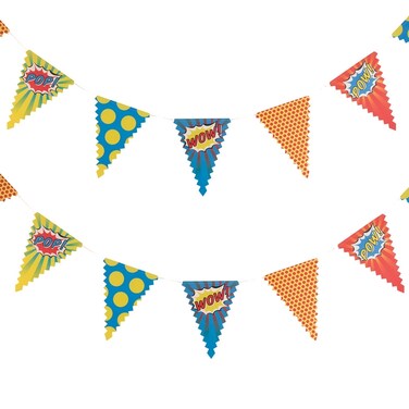 This bunting will jazz up any party venue. Great for lots of special occasions from an adults 30th birthday party to a kids superhero themed party. The bunting is made of card and is 3.5 metres long with 14 flags which are 22.5cm long and 15.5 cm wide at the top.