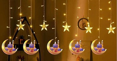 RAMADAN LIGHTING, 3.5m, LED Star Moon Curtain Decorative Lights, Window Curtain Fairy String Lights, Remote Control, for indoor, Home