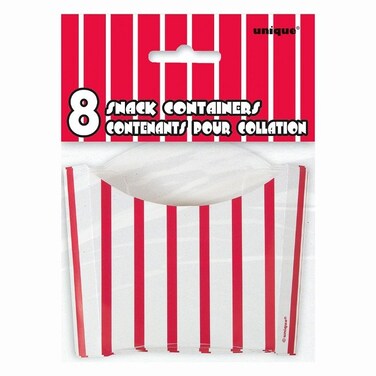 These Red and White Paper Snack Cups are perfect for serving French fries, chips, pretzels, and more at a circus theme party, carnival theme party, or picnic. Package of 8 Red and White Striped Paper Snack Containers,Paper Striped Snack Containers measure 3.75" x 3.25" x 1.25".