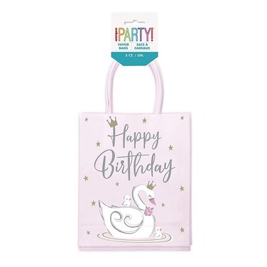 PACKAGE INCLUDES: 3 pink gift bags.ELEGANT DESIGN: These gift bags feature a "Happy Birthday" headline designed with a swan wearing a gold crown.EASY LOADING: These gift bags have a rectangular bottom, and easily stand up on their own.ECO-FRIENDLY MATERIAL: These eco-friendly gift bags are made of good quality paper.CONVENIENT TO USE: Use these gift bags for a fast and simple alternative to standard gift wrapping.