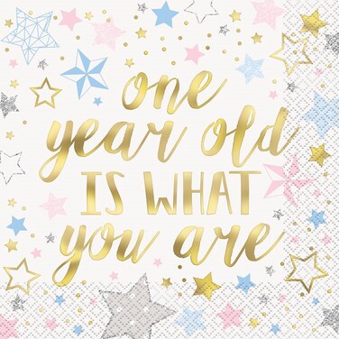Details:• 16 Foil Twinkle Twinkle Little Star 1st Birthday Beverage Napkins• Paper Drink Napkins measure 5" x 5"• Ideal for gripping ice cold party drinks• Stamped with shiny gold foil text on one side• Adorable for any boy or girl first birthday party• Combine with more Twinkle Twinkle Little Star party supplies