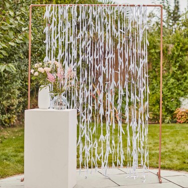 Hang to complete your room set-up or as a showstopping centrepiece. The neutral white colour is a versatile backdrop for all of your photos - just combine with our photobooth props for the ultimate DIY photo booth. Easy to assemble, this wedding decoration is perfect to use as a photobooth backdrop or for styling at your reception. Each pack contains 1 x 100m White Leaf Ribbon Backdrop to customise the length with. Packaging is recyclable and FSC certified.