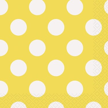 Cocktail Napkins are perfect for serving with drinks and appetisers, protecting your party surfaces from stains, or wiping up unexpected spills at any celebration. Disposable napkins also make the after party clean-up really quick and convenient. Pack of 16 Yellow Polka Dot Cocktail Napkins measures approximately 5" x 5" (13cm x 13cm)