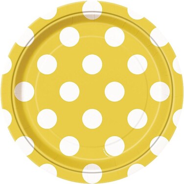 Perfect for serving small snacks and cake, these disposable plates also make the after party clean-up really quick and convenient. Pack of 8 Yellow Polka Dot Paper Plates measure approximately 18cm (7") in diameter