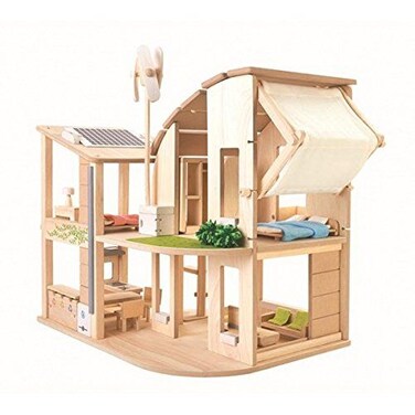 - Our amazing Plan Toys Green Dollhouse With Furniture will engage your pre-schooler in imaginative play while teaching them about the art of eco-friendly living at the same time! The energy-efficient design includes the following features: Rain Barrel Roof-Top Solar Panels Wind Turbine Biofacade Recycling Bins This wooden dollhouse includes furniture to fully furnish five rooms: Living Room Kitchen Bedroom Kids' Room Bathroom