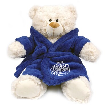 Caravaan - Teddy Cream 38cm with Blue Bathrobe with Happy Birthday