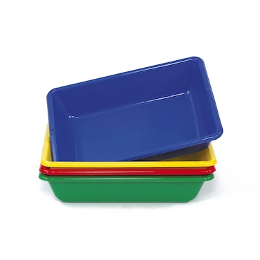 These stackable sand & water trays are perfect for easy storage.Ideal for sand play, water play, messy play and exploration activities.Such a versatile pack of trays for many uses!Set includes 1 red, 1 blue, 1 yellow and 1 green tray.Size 50 x 70 x 15cm deep.