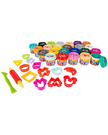 - Mickey 24pc Mega Dough Set includes 24 dough tubs in box, 12x cutters, 1 x roller, 1 dough knife