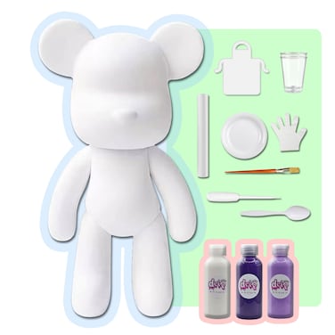 INSTRUCTIONS: 1. Set up your working area with plastic sheet. Wear gloves and plastic apron on. 2. Pour paint, alternating different colors in small amounts into plastic cup. Do not mix. 3. Slowly and evenly pour paint over the bear. You can adjust colors with the paint brush, ad or remove paint with the pipette. 4. Once you have the desired look, set aside on a clean surface to dry. Allow 24hrs for your bear to completely dry.