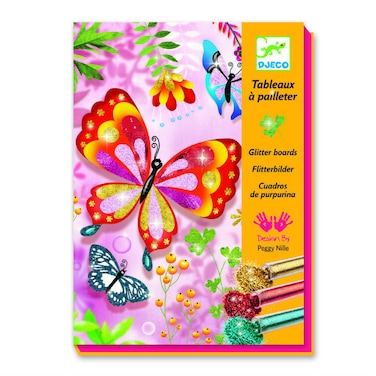 Contains: 4 sticky faced boards, 6 tubes with coloured glitter, 1 gadget, 1 brush, 1 step by step colour booklet