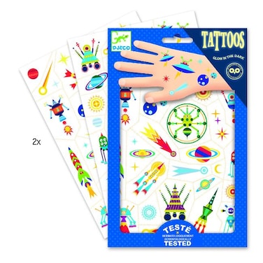 Outer Space themed temporary tattoos with glow in the dark effect.