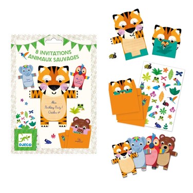 A lovely pack of 8 wild animal design invitation cards with stickers and googly eyes. The pack contains 8 animal invitations, 16 stick on googly eyes, a sheet of stickers and 8 envelopes.