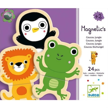 - <p>Cozy on the refrigerator with this puzzling wooden magnets jungle animals 'Coucou' of the French brand Djeco.<p>The set consists of 12 different animals including a hippo, a panda and a rabbit, his dancing and whooping depicted on the magnets.<p>And each animal is made up of two parts. This calls for crazy combinations!<p>They fit also on a magnetic (school) board.Packaged in a handy cardboard storage box.<p>Suitable for 2 yrs up. Pack Size 21.5x18.5x4 cm<p>