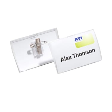 Moulded polypropylene fold out name badge with replaceable blank inserts. The front and back sections of these one piece name badges are joined by a flexible hinge, enabling quick and simple replacement of the badge inserts. 54 x 90 mm. combi clip. Durable 8214-19