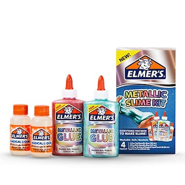 - For slime that shimmers and glistens, pick up the Elmer's Metallic slime kit! This inclusive kit includes 1 bottle each of Metallic glue in Teal and pink. Elmer?s craft glue adds a vibrant touch to arts, crafts, and glue slime! The kit also includes 2 bottles of Elmer's magical liquid-a glue slime activator that's a less messy substitute for contact lens solution and baking soda. Spark your kids? creativity with custom slime and elmer?s!