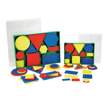 Geometric Plastic shapes consisting of 6 each of 10 shapes. Each shape comes in 3 colours and 2 different thicknesses. Small square approx. 50mm, square in large set approx. 85mm. Each set comes in a plastic storage box with lid.