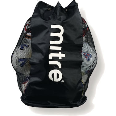 This Mitre Mesh panelled bag is a Heavy-duty essential piece of kit.Drawstring closure.Ventilation panels to allow fast drying.Holds 12, size 5 footballs.Nylon with mesh.Balls not included.Wipe clean only.