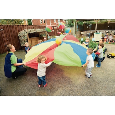A parachute is a wonderful addition to the play equipment in any school,Playing with parachutes is a great way to promote teamwork among children.Reinforces turn-taking, sharing, promotes social interaction, enhances language development.Beautiful and sometimes calming, a parachute can create soft, whispering sounds or loud, rippling noises, depending on how quickly it is moved.12 Handles5m Diameter