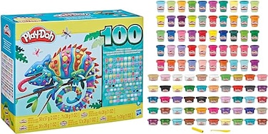 This Play-Doh set for kids 3 and up features 100 cans in 5 types: 57 classic colors (2-ounce and 1-ounce cans), 20 Sparkle, 12 Metallic Shine, 4 Super Shimmer, and 7 Confetti colors. Perfect for sharing, parties, and crafts. Contains wheat. Dimensions: 11.7 x 34 x 26.7 cm; 5.09 kg. Recommended age: 3+. Model: F4636. Encourages creative skills. No assembly or batteries required. Multicolor foam material.