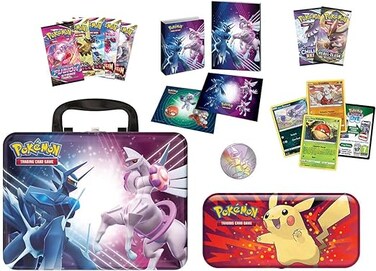 Get ready for class with the Pokémon TCG Back to School Pencil Case! This sturdy metal case is packed with over a dozen special Pokémon goodies, including 2 booster packs and a tin for storing pens and pencils. Upgrade to the Pokémon TCG Collector Chest for even more treasures, including 5 booster packs, colorful sticker sheets, foil cards featuring Hisuian Voltorb, Hisuian Growlithe, and Hisuian Sneasel, a Pokémon coin, mini portfolio, Pokémon notebook, and a code card for Pokémon TCG Live. Organize your supplies and add to your Pokémon TCG collection with these fun and functional sets!