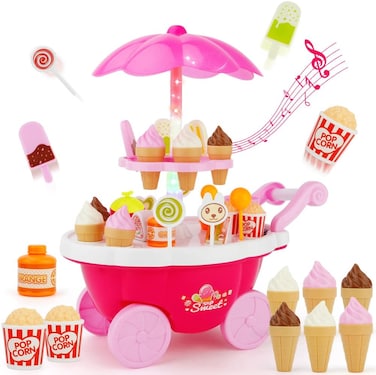 2.39 DIFFERENT TOYS FOR ENDLESS FUN: Our 59-piece ice-cream trolley includes colorful icecream cones, ice-lollies, lollipops, food, utensils and coins for a realistic ice-cream truck experience!