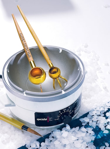 - The ideal size for the home crafter or a small workshop creating batik designs, this shallow traditional shape wax melting pot has six slots in the rim for resting round tjanting tools so that the wax drips back into the pot. Includes a thermostatic controller to make sure the wax is maintained at the correct temperature whilst a safety thermostat prevents overheating. 300ml capacity. Maximum temperature 135 degrees. 100 x 165mm.