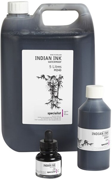 - Premium quality black Indian ink from Specialist Crafts. Highly pigmented, this opaque black shellac-based ink flows exceptionally well when applied using a brush or dip pen. When diluted with water, this Indian ink is ideal for using with an airbrush. Dries to a satin, waterproof finish that resists bleaching and smearing. Mix well before use to ensure the pigment is distributed throughout the ink - for best results stir thoroughly ensuring any settled pigment is scraped from the bottom of the bottle. Economical 5 litre jerry can.