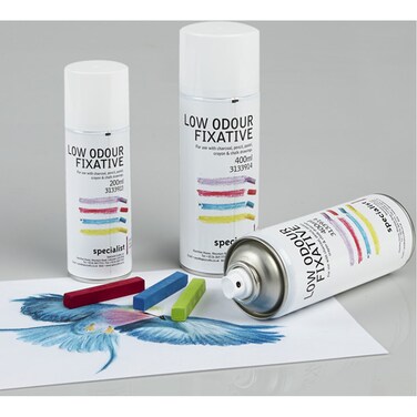 - Aerosol fixative for use with charcoal, pastels, pencils and crayons. Fixative can be used on all kinds of artists' mediums to render work rub and smudge resistant. It is essential for examination artwork as fixative ensures the work can be stored and presented for assessment in first class condition! Our low odour spray fixative is ozone friendly. When spraying fixative always prop work up rather than lying it flat and spray from a distance of 25-30cm for even coverage.