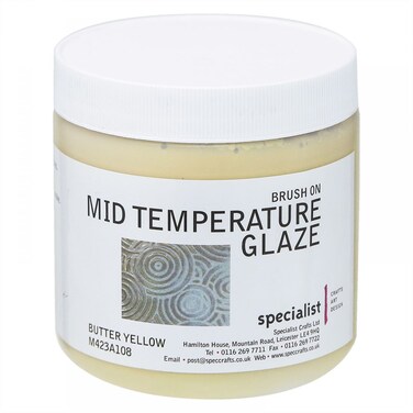 - Add an extra dimension to textured pieces with this Mid Fire Brush on Glaze from Specialist Crafts. The minerals in the glaze will break through on the raised or recessed areas to highlight the texture in the design. Finish and effect will depend on the firing temperature. 473 bottles. Lead-free and food safe. Butter Yellow with gloss finish.