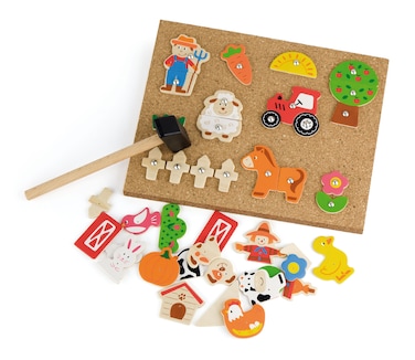 • This play set includes 24 different elements we usually can see in a farm (a farmer, a barn, a tractor, different animals and plants, and so on), 1 cork board, a hammer and a box of tacks. Tack these wooden figures on the cork board following the guiding booklet to complete the challenges